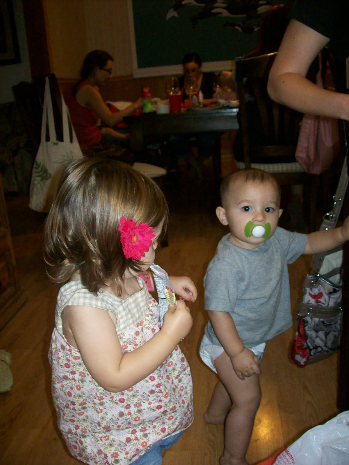 Please pay attention to my daughter in the foreground who spent most of her time trying to steal baby Max's pacifier. "I remember these! It was heaven, like hands-free thumbsucking! Think of the multi-tasking, a pacifier AND pulling all the DVDs from the entertainment center!"