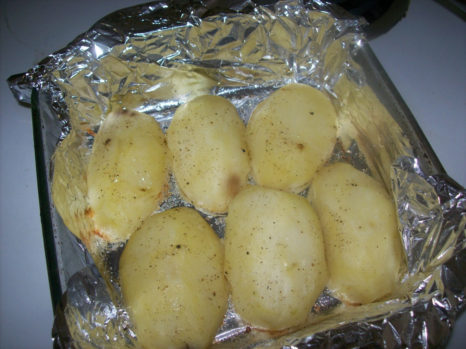 After 30 minutes, take potatoes out. They'll look like this. Don't worry, they won't be browned yet: