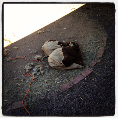This is just one portion of the yard that was utterly covered. The grass patch was littered with stuffing. The area by the gate was covered. There was fluff on the patio. There was fluff in potted plants. It was impressive in its coverage. I literally said "OH MY GOD." when I opened the rolling shutter that covers the sliding glass doors. Even Alexandra knew something was amiss.